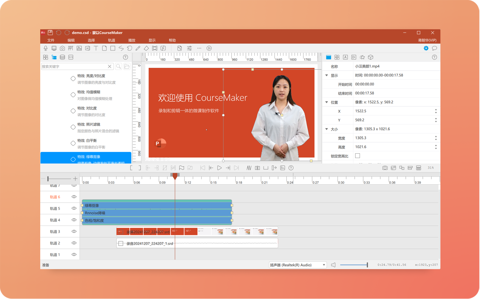 从蒙以CourseMaker 7.0的组件库中的特效工具来增强您的视频,比如说绿幕抠像工具、图像增强工具、声音降噪工具等,转场动画、画质增强……这些工具应有尽有,这会使您的视频栩栩如生。您还可以在录制后轻松调整光标,让默认的光标模式更加突出显示,让你的观众更加聚焦于你的重点。